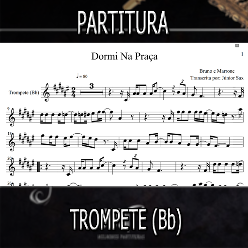 Partitura da música Dormi Na Praça (Bruno e Marrone) para Trompete (Bb). Se você deseja executar esta música é só investir apenas este valorzinho mínimo. Esta partitura está de acordo com a tonalidade original, porém, se você desejar em outra tonalidade, basta entrar em contato conosco e enviar um comprovante de compra. O atendimento é altamente rápido e estamos disponíveis das 7:00 as 18:00 horas.