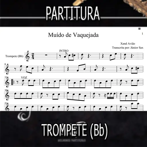 Veja o vídeo-partitura da música Muído de Vaquejada (Xand Avião) para Trompete (Bb) em nosso canal do YouTube clicando aqui. E temos mais de 100 vídeo-partituras disponíveis no canal dos gêneros musicais (MPB, Forró, Sertanejo, Rock nacional, Internacionais, Pagode, Samba, Axé, Gospel, Religiosas, dentre outros).