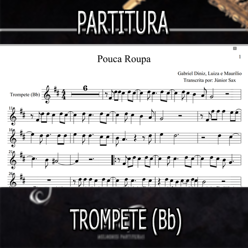 Veja o vídeo-partitura da música Pouca Roupa (Gabriel Diniz Luiza e Maurilio) para Trompete (Bb) em nosso canal do YouTube clicando aqui. E temos mais de 100 vídeo-partituras disponíveis no canal dos gêneros musicais (MPB, Forró, Sertanejo, Rock nacional, Internacionais, Pagode, Samba, Axé, Gospel, Religiosas, dentre outros).